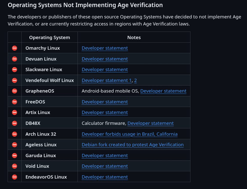A Github page by BryanLunduke, that lists primarily linux-based distributions and their status on the controversial age verification debacle has been set up for users.